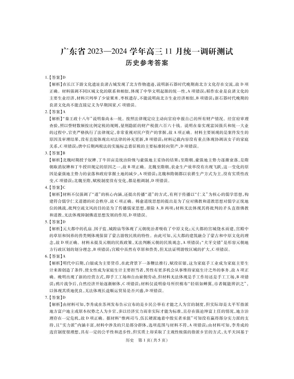 广东省2023-2024学年高三上学期12月统一调研考试 历史答案