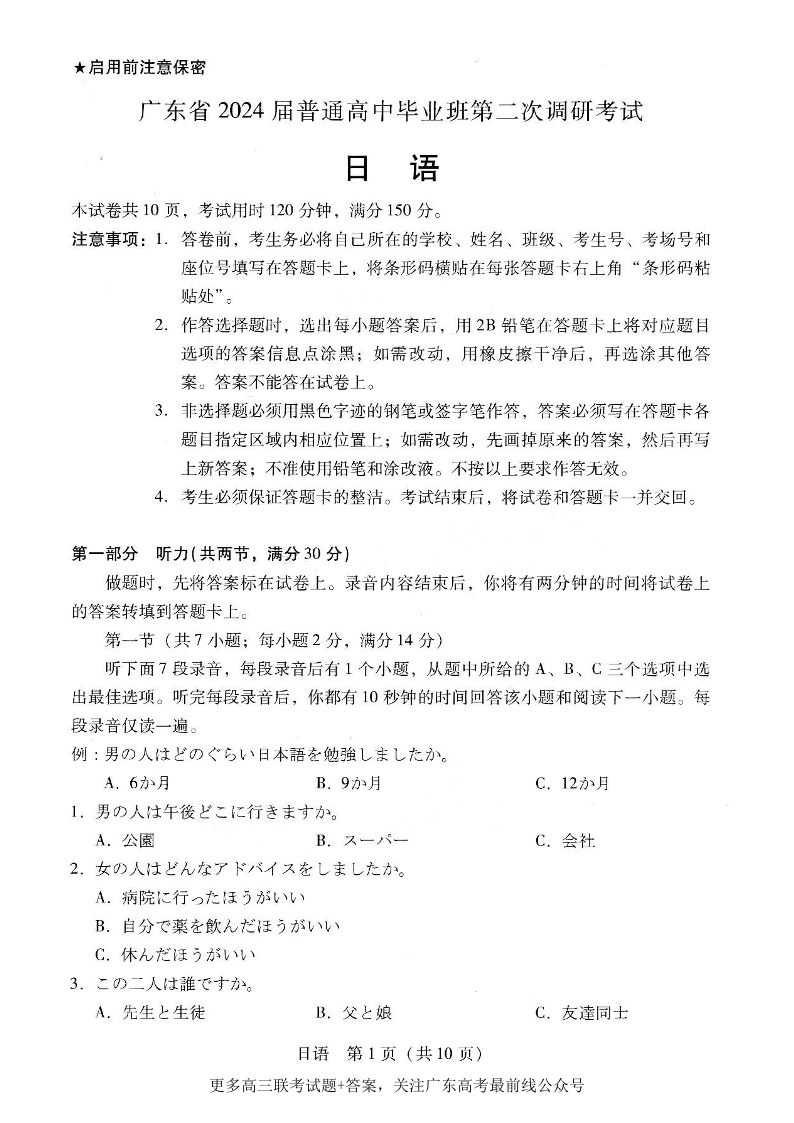 广东省普通高中(粤光联考)2023-2024学年高三上学期第二次调研考试 日语