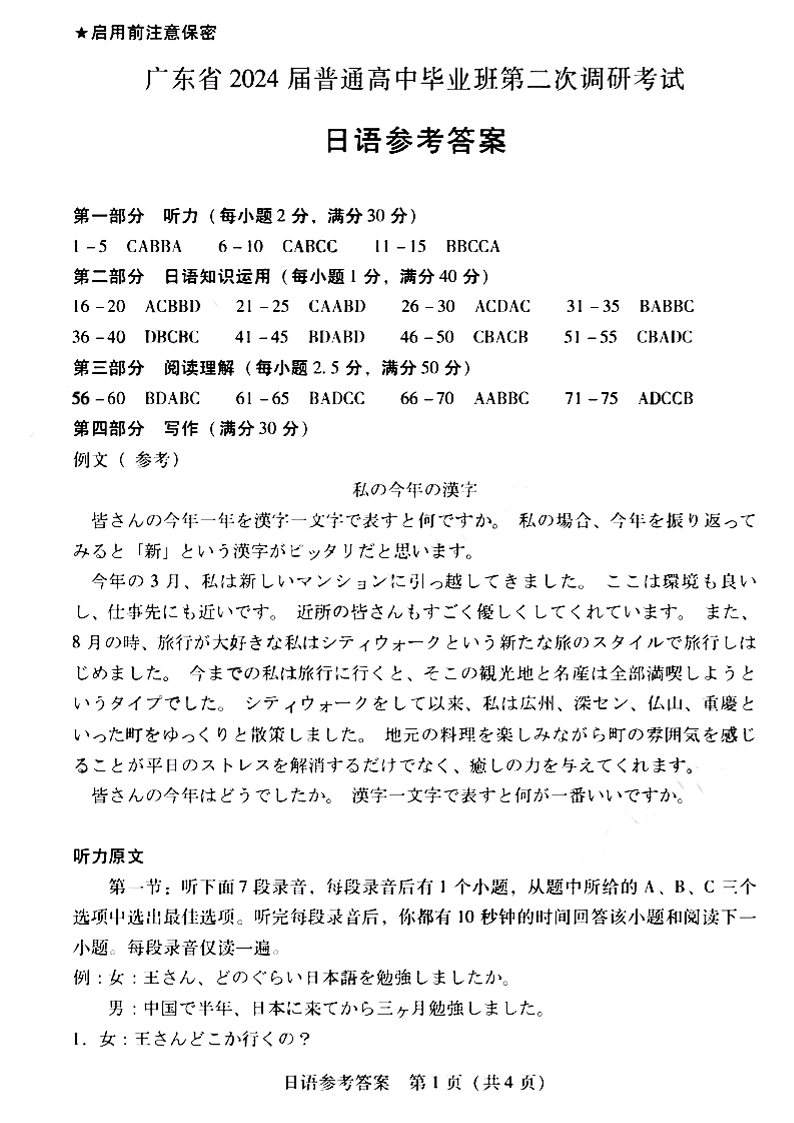 广东省普通高中(粤光联考)2023-2024学年高三上学期第二次调研考试 日语答案