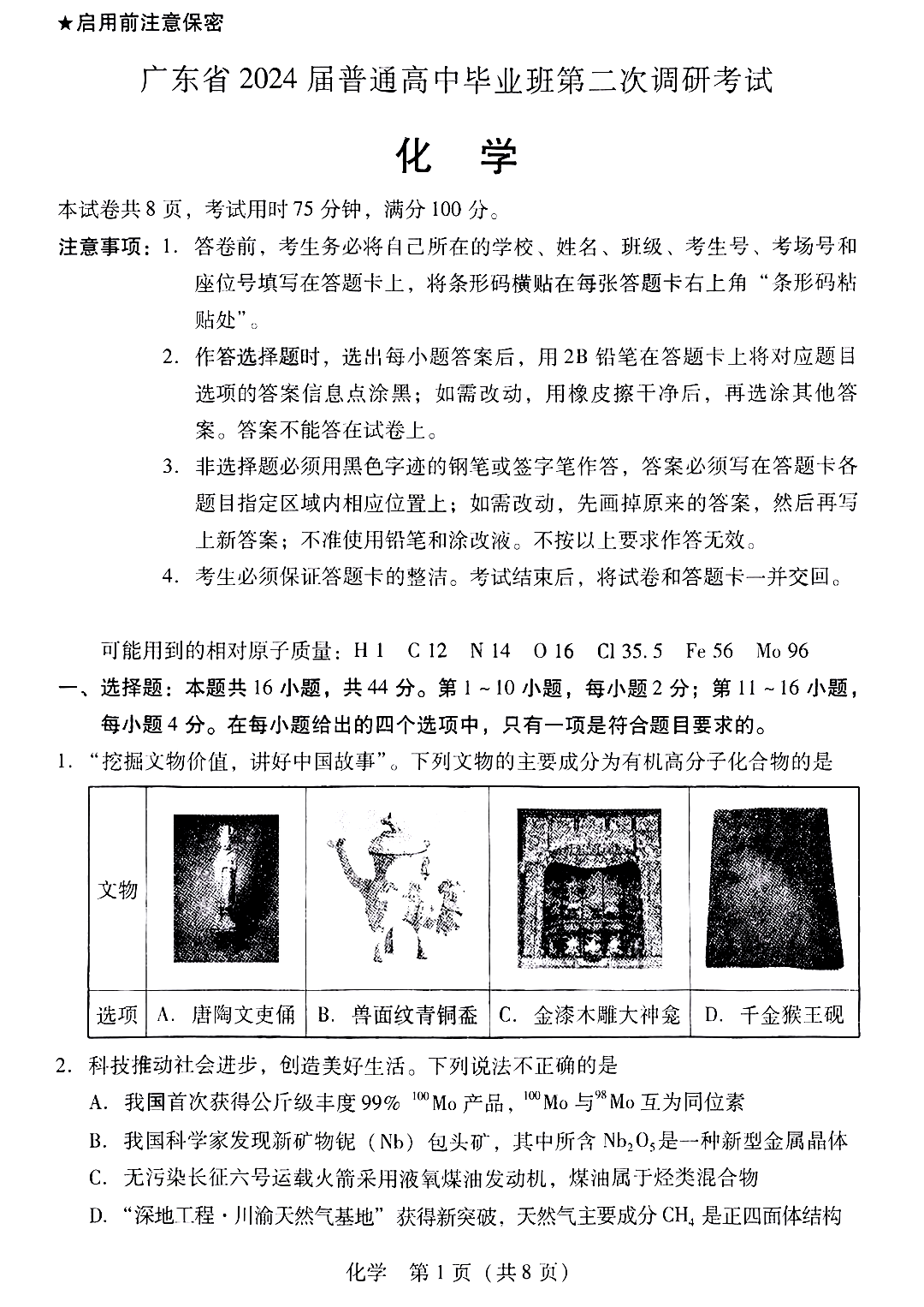 广东省普通高中(粤光联考)2023-2024学年高三上学期第二次调研考试 化学