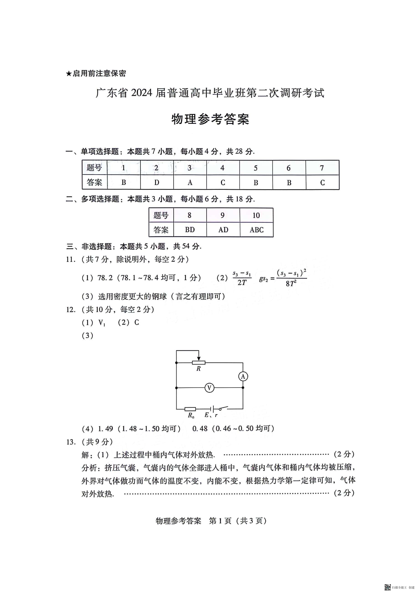 广东省普通高中(粤光联考)2023-2024学年高三上学期第二次调研考试 物理答案