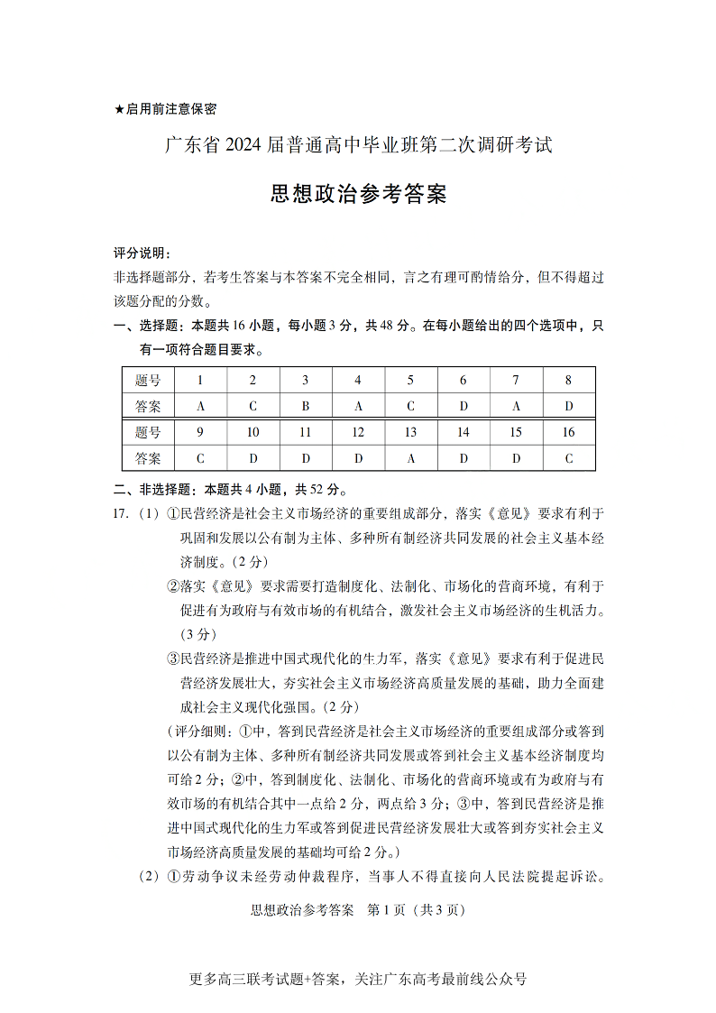 广东省普通高中(粤光联考)2023-2024学年高三上学期第二次调研考试 政治答案