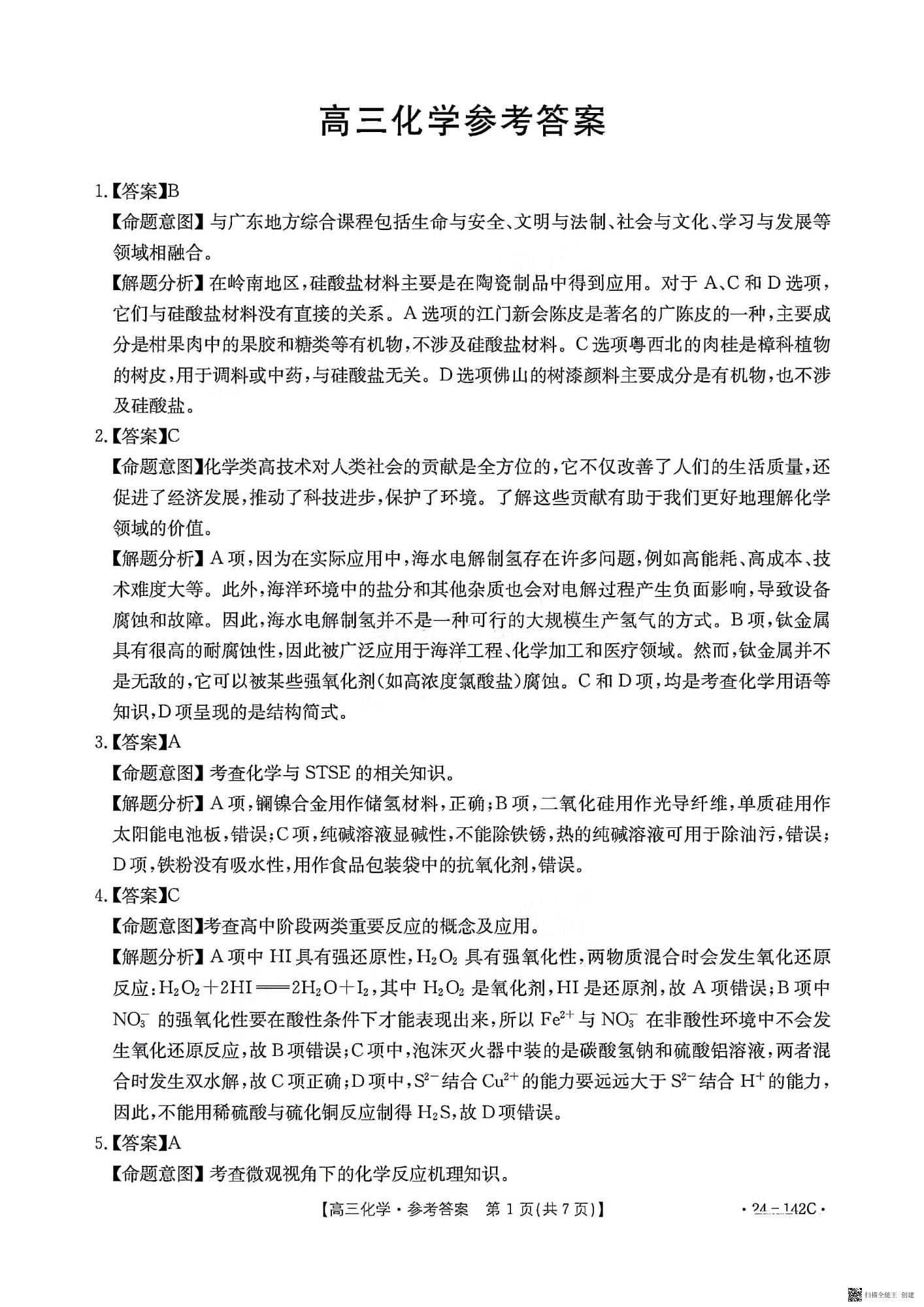 广东省部分学校2023-2024学年高三上学期11月大联考 化学答案