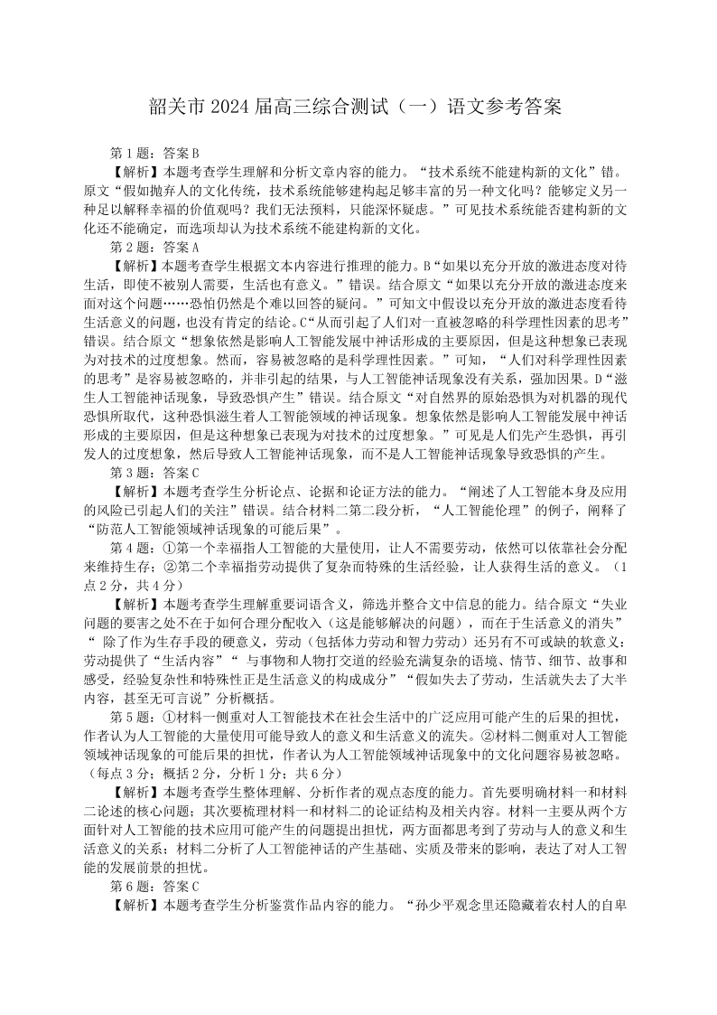 韶关市2024届高三综合测试(一)语文答案