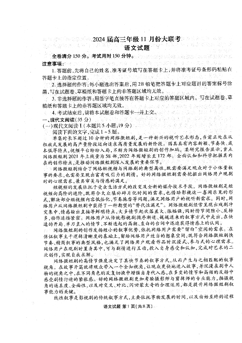 广东衡水金卷2024届高三年级11月大联考 语文