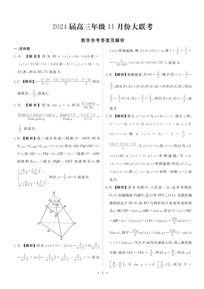 广东衡水金卷2024届高三年级11月大联考 数学答案