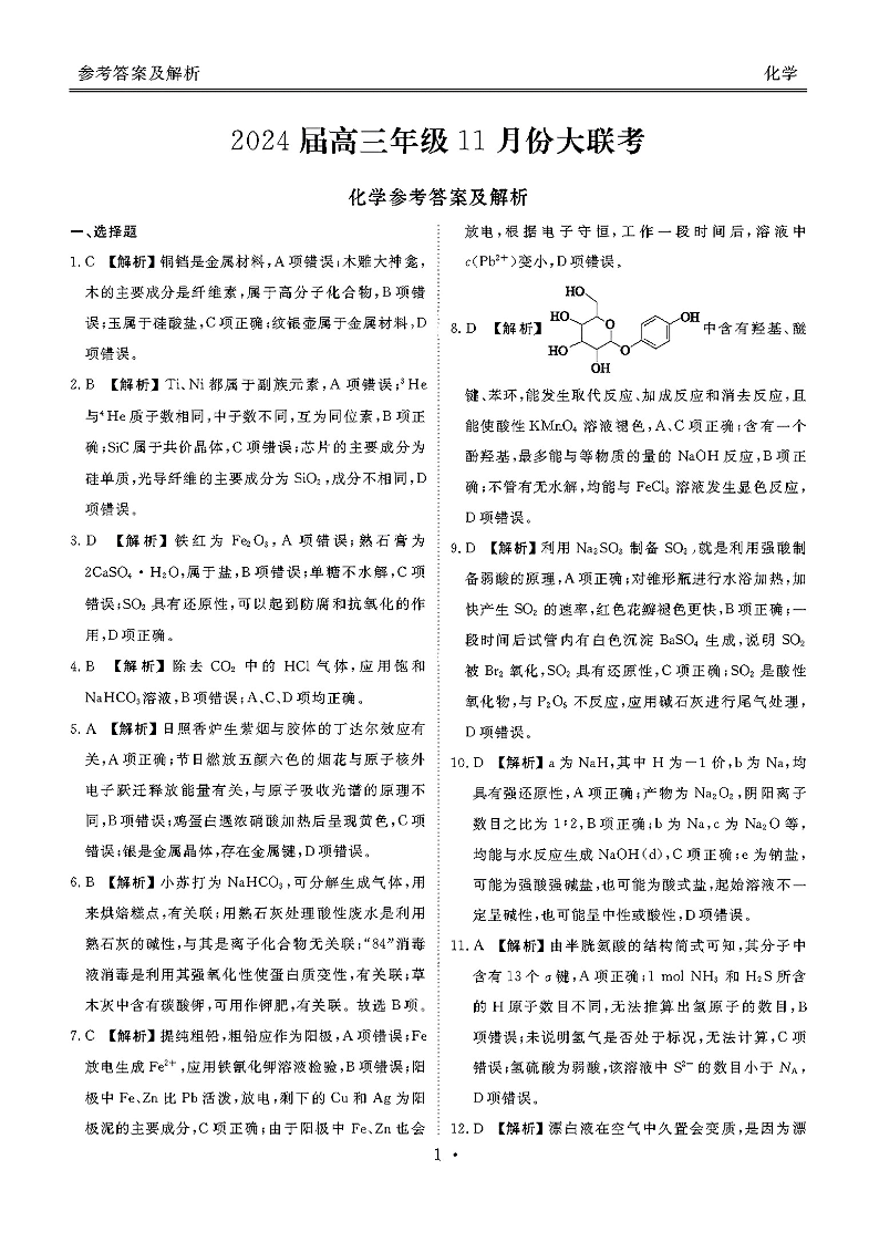 广东衡水金卷2024届高三年级11月大联考 化学答案