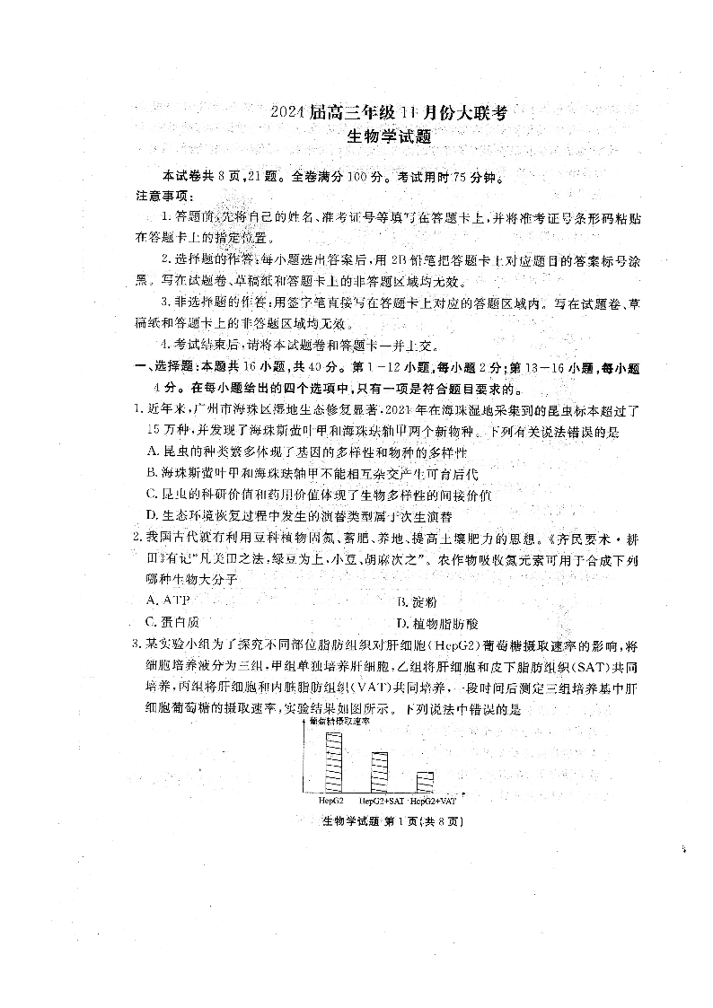 广东衡水金卷2024届高三年级11月大联考 生物