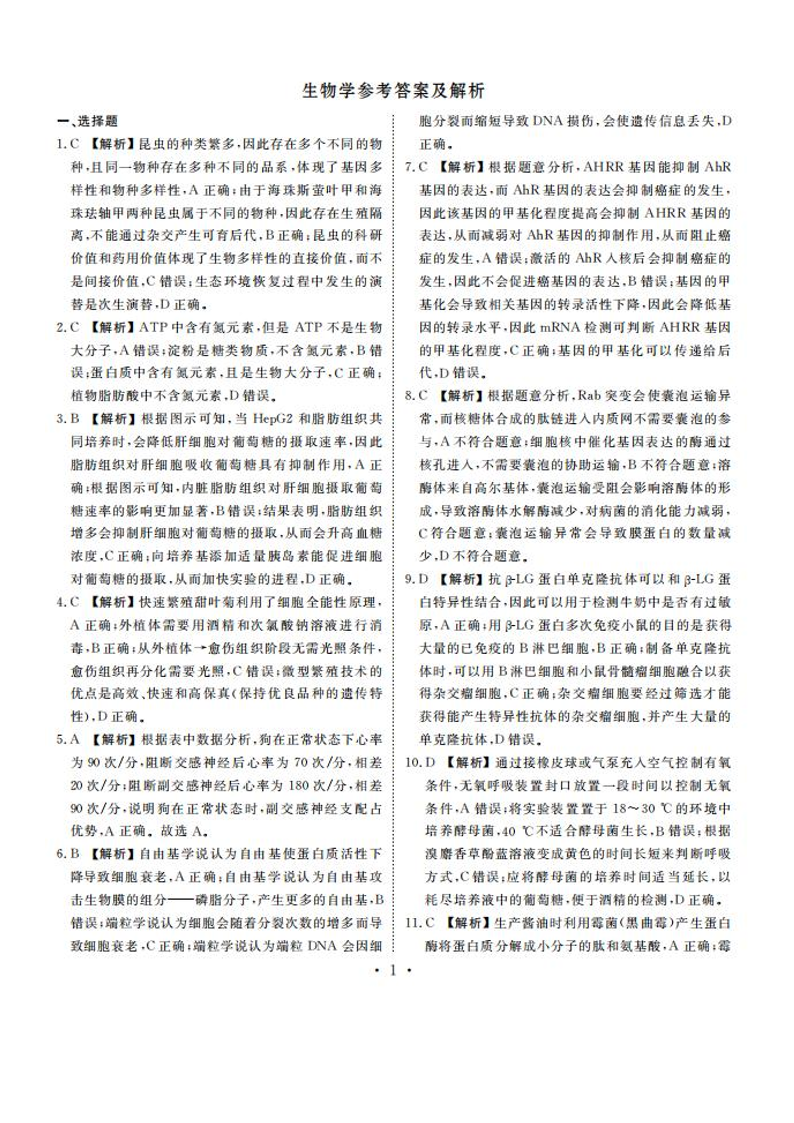 广东衡水金卷2024届高三年级11月大联考 生物答案