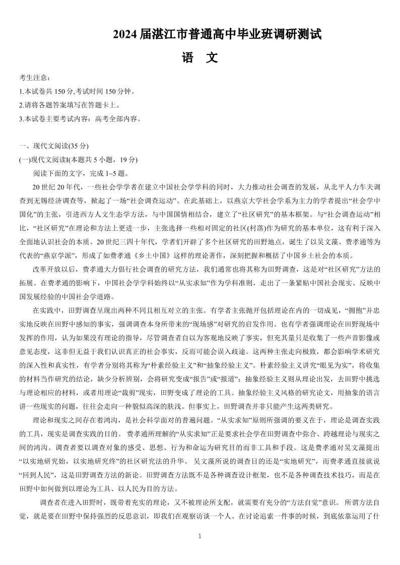 广东省湛江市普通高中2023-2024学年高三上学期10月调研考试 语文