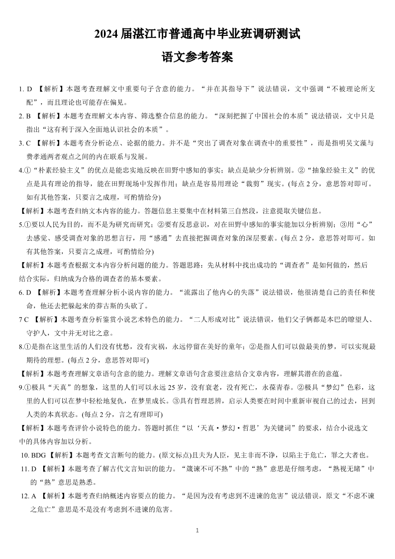 广东省湛江市普通高中2023-2024学年高三上学期10月调研考试 语文答案