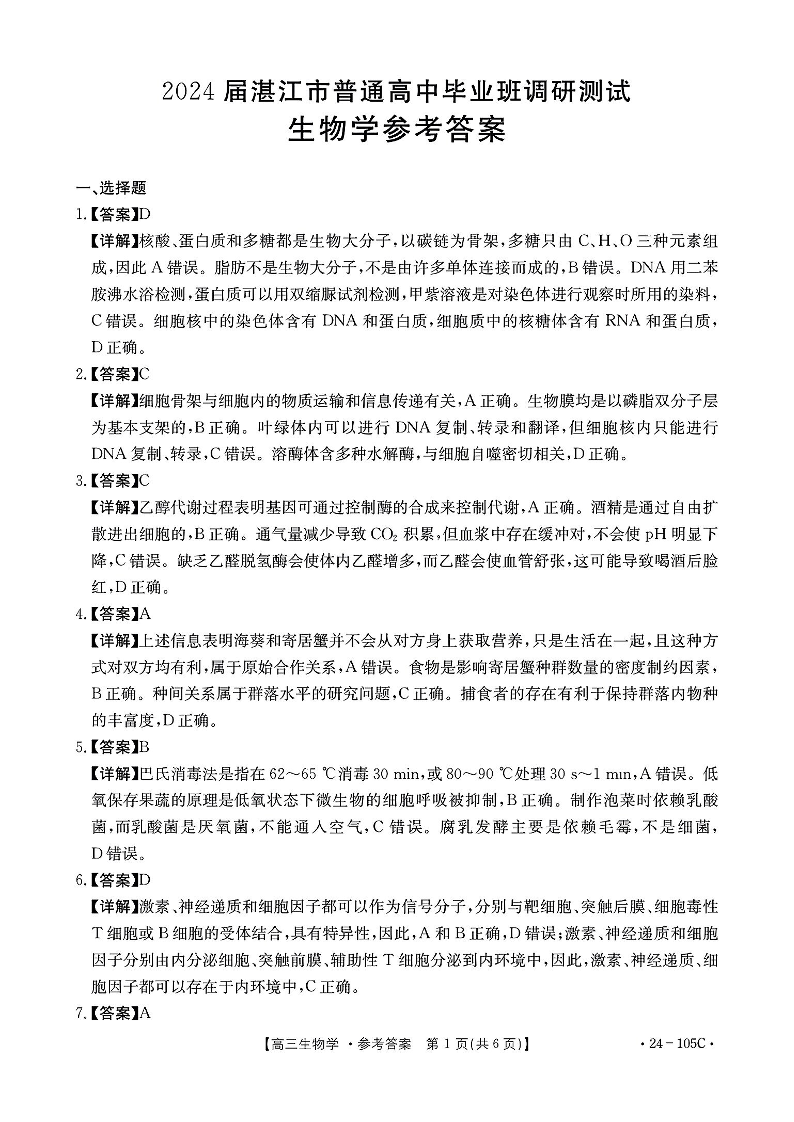 广东省湛江市普通高中2023-2024学年高三上学期10月调研考试 生物答案