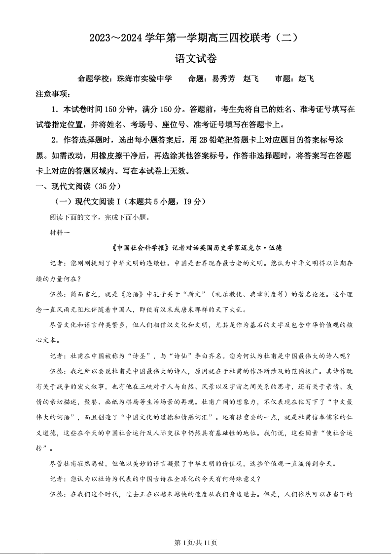 广东省四校2023-2024学年高三上学期联考(二)语文
