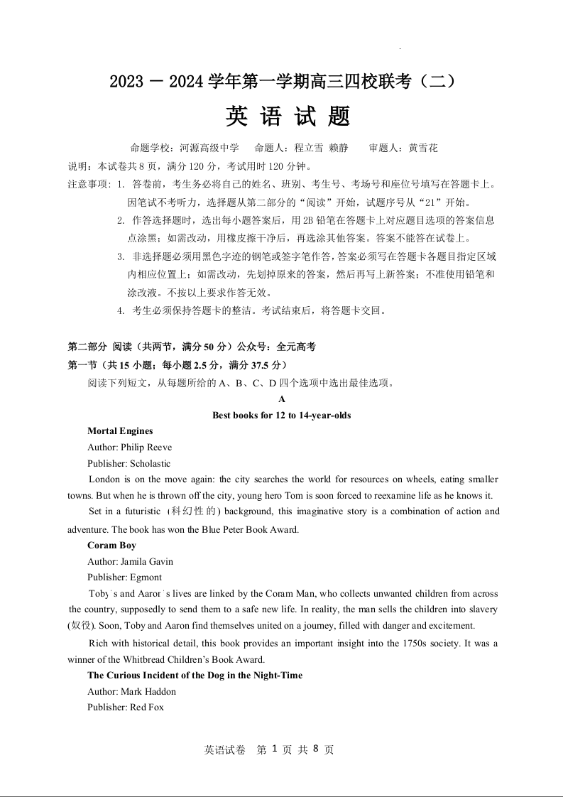 广东省四校2023-2024学年高三上学期联考(二)英语