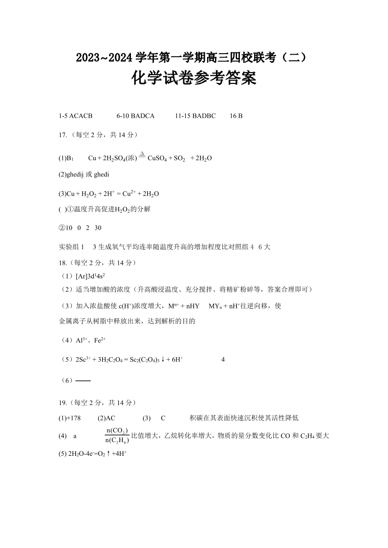 广东省四校2023-2024学年高三上学期联考(二)化学答案