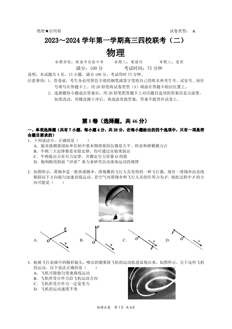 广东省四校2023-2024学年高三上学期联考(二)物理