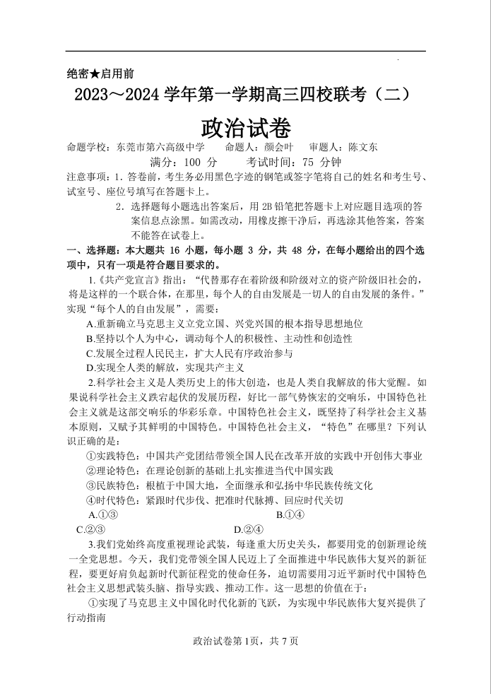 广东省四校2023-2024学年高三上学期联考(二)政治