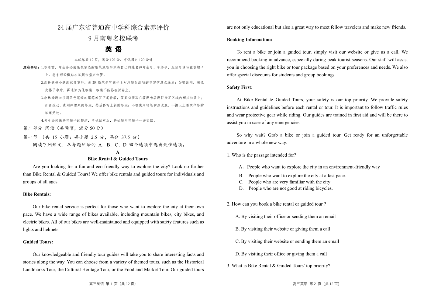 广东省南粤名校联考2023-2024学年高三上学期9月月考 英语