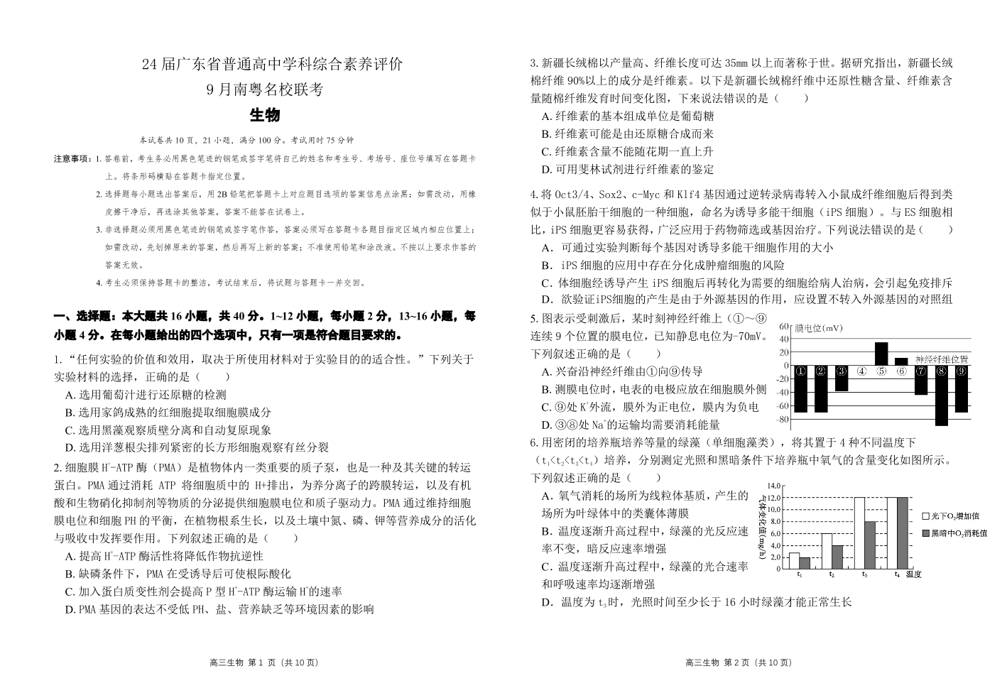 广东省南粤名校联考2023-2024学年高三上学期9月月考 生物