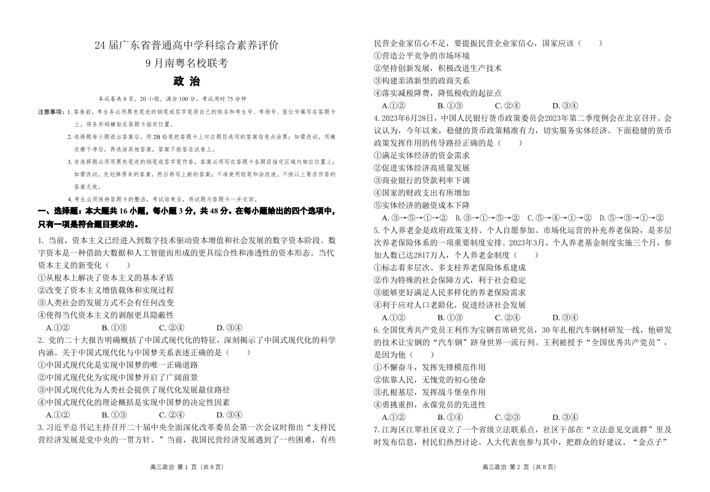 广东省南粤名校联考2023-2024学年高三上学期9月月考 政治