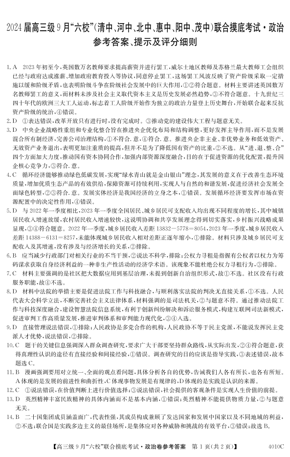 广东省2024届高三级9月“六校”(清中、河中、北中、惠中、阳中、茂中)联合摸底考试 政治答案