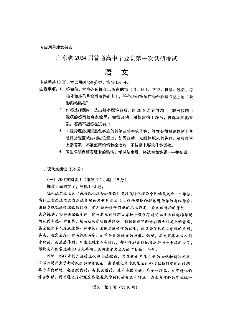 广东省2024届高中毕业班第一次调研考试(粤光联考)语文