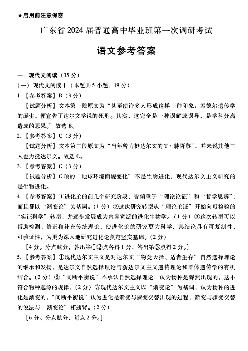 广东省2024届高中毕业班第一次调研考试(粤光联考)语文答案
