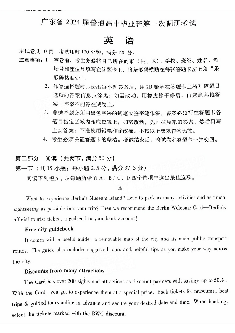 广东省2024届高中毕业班第一次调研考试(粤光联考)英语