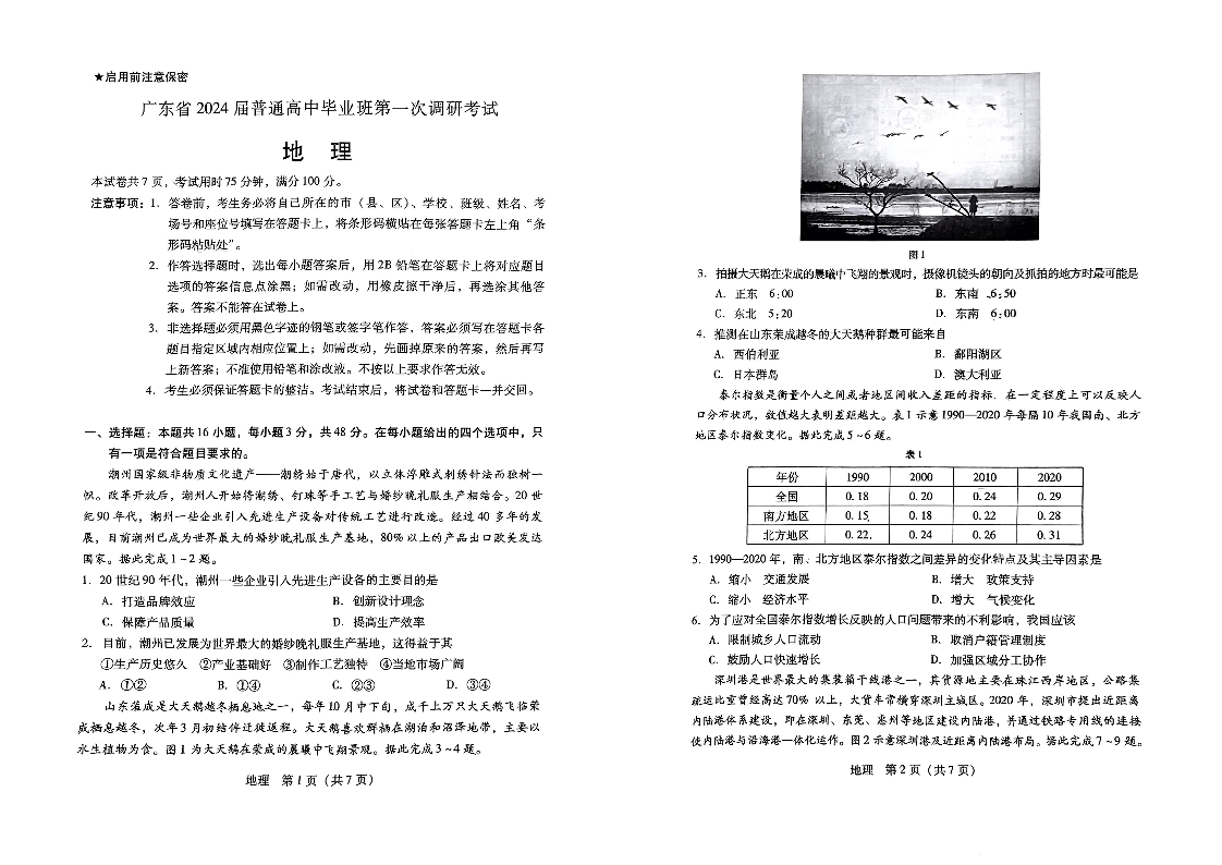 广东省2024届高中毕业班第一次调研考试(粤光联考)地理