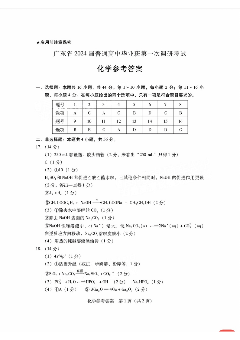 广东省2024届高中毕业班第一次调研考试(粤光联考)化学答案