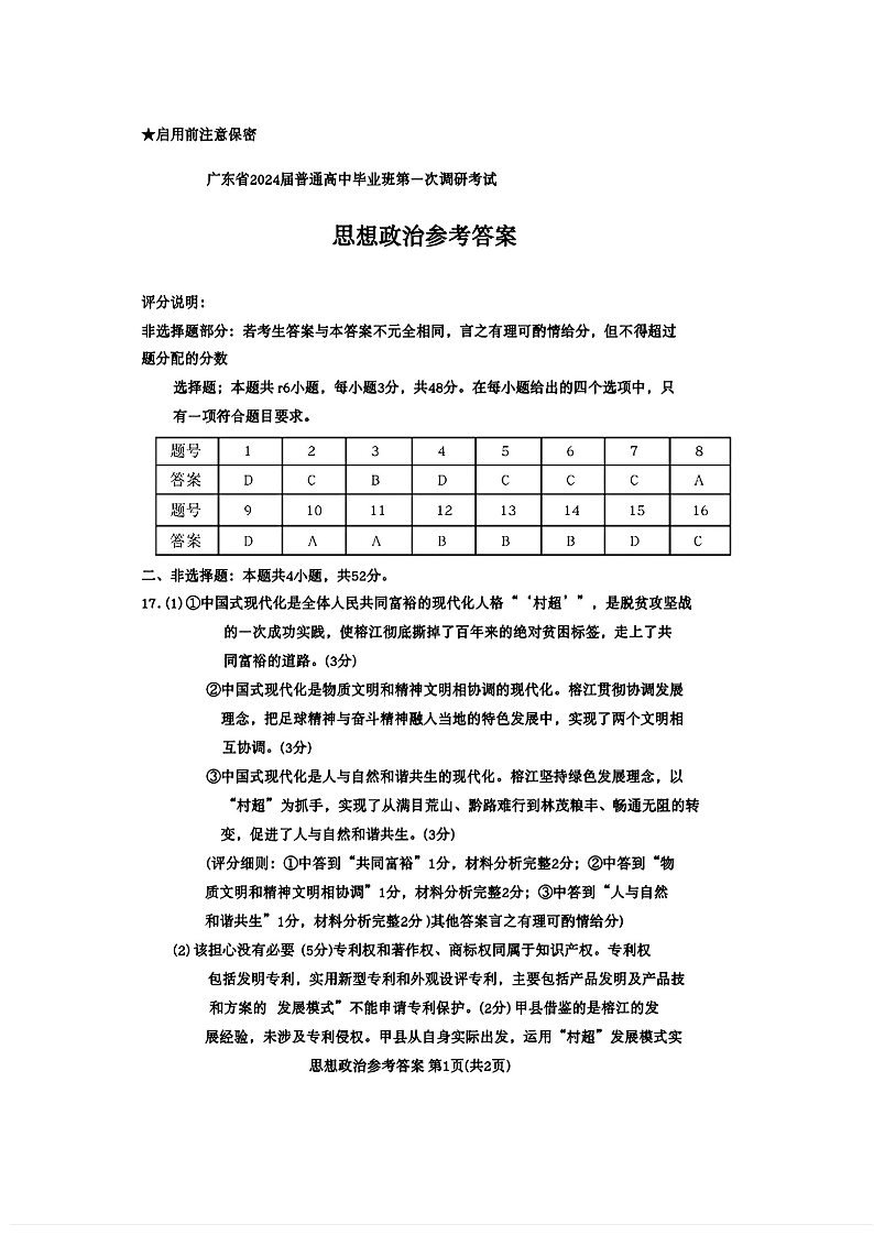 广东省2024届高中毕业班第一次调研考试(粤光联考)政治答案