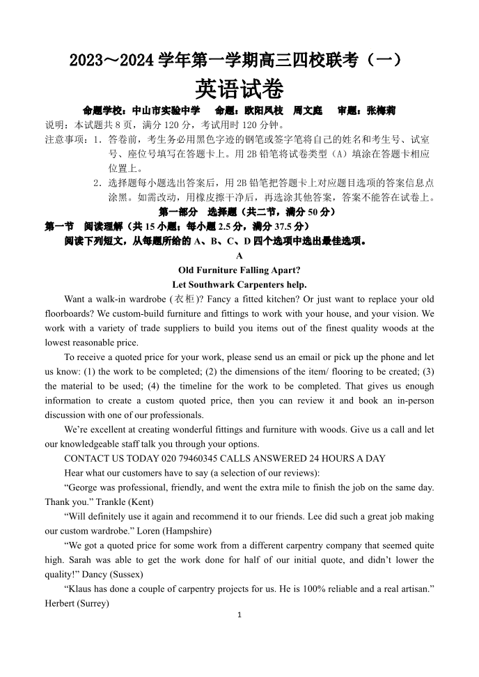 广东省四校联考2023-2024学年高三上学期第一次联考 英语