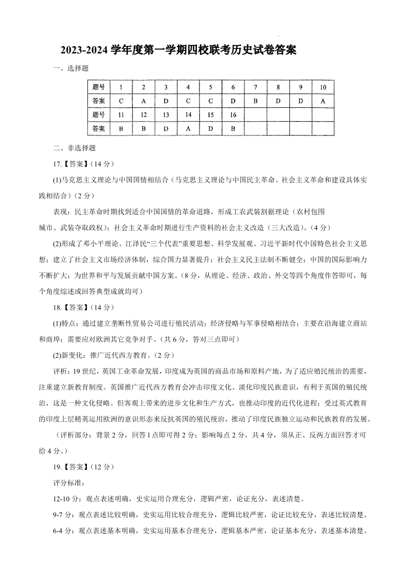 广东省四校联考2023-2024学年高三上学期第一次联考 历史答案