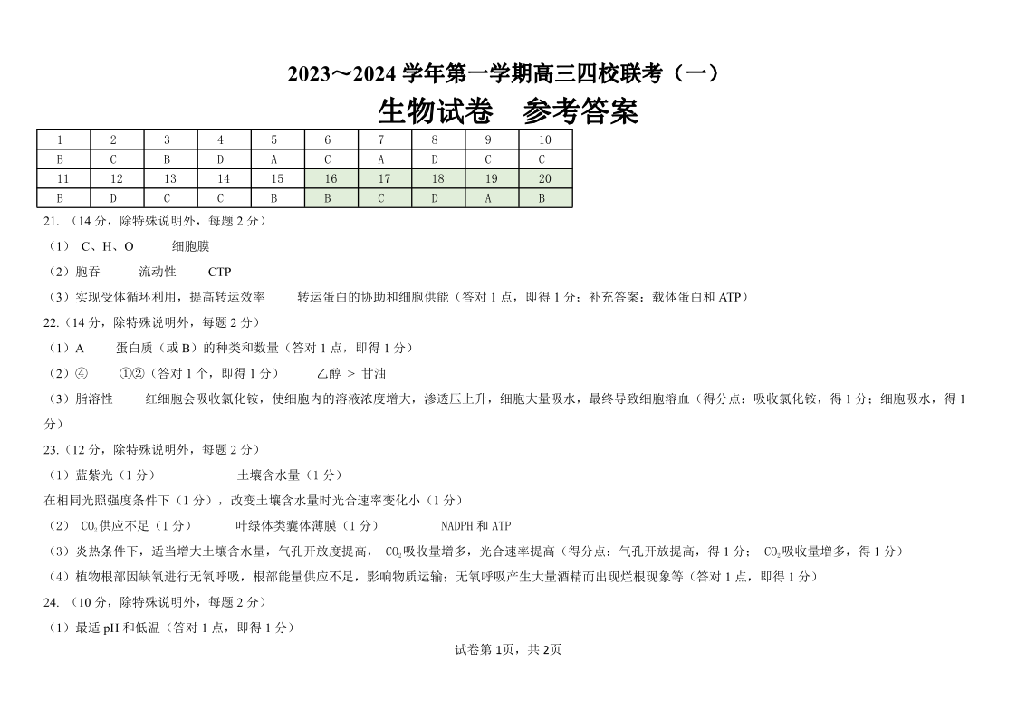 广东省四校联考2023-2024学年高三上学期第一次联考 生物答案