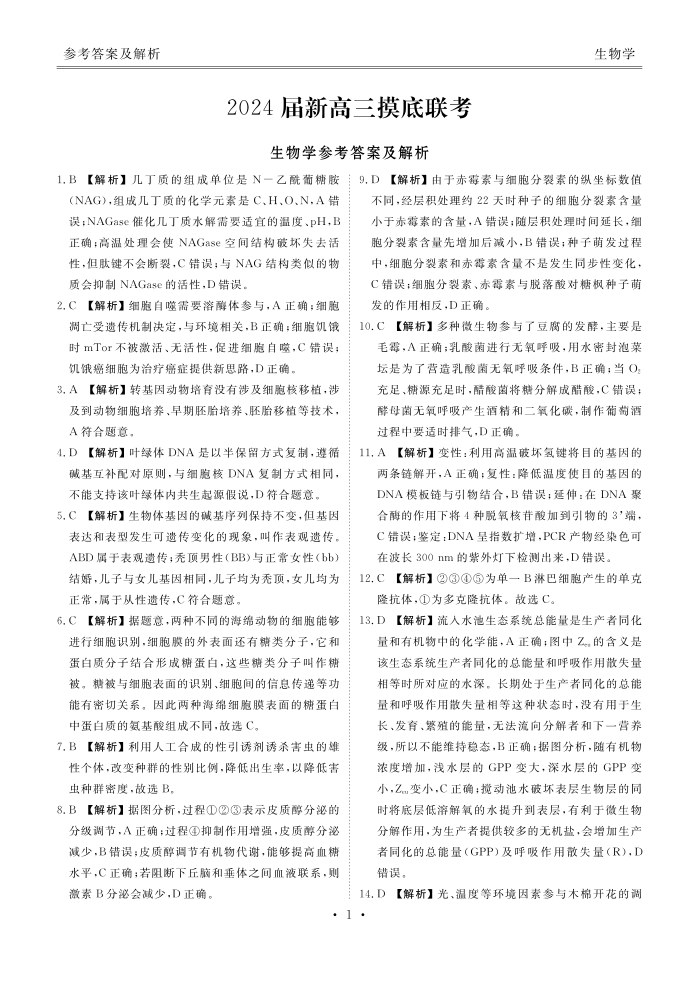 广东省衡水金卷2024届高三上学期摸底联考 生物学答案