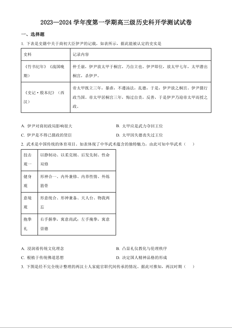 广东省广州市执信中学2023-2024学年高三上学期开学考试 历史试题(原卷版)