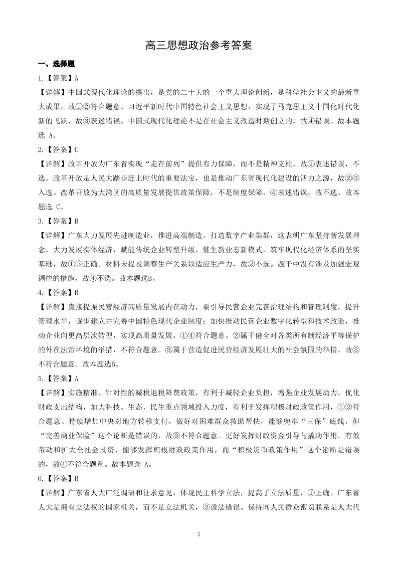 2024届广东省部分学校高三上学期8月联考 政治答案