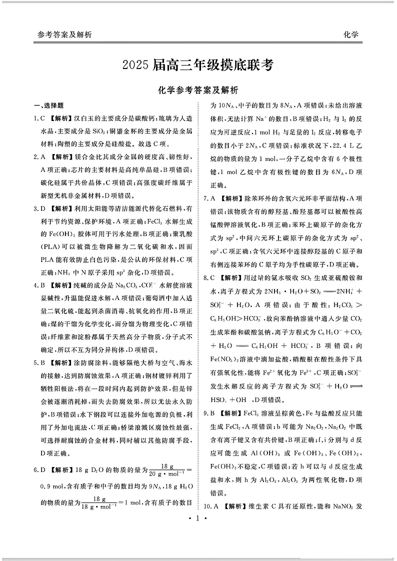 广东省衡水金卷2025届高三年级上学期8月摸底联考+化学答案