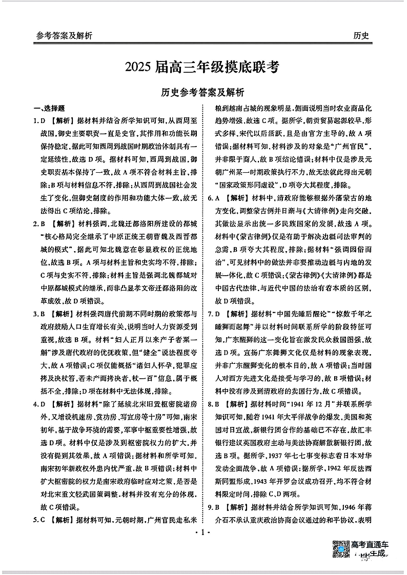 广东省衡水金卷2025届高三年级上学期8月摸底联考+历史答案