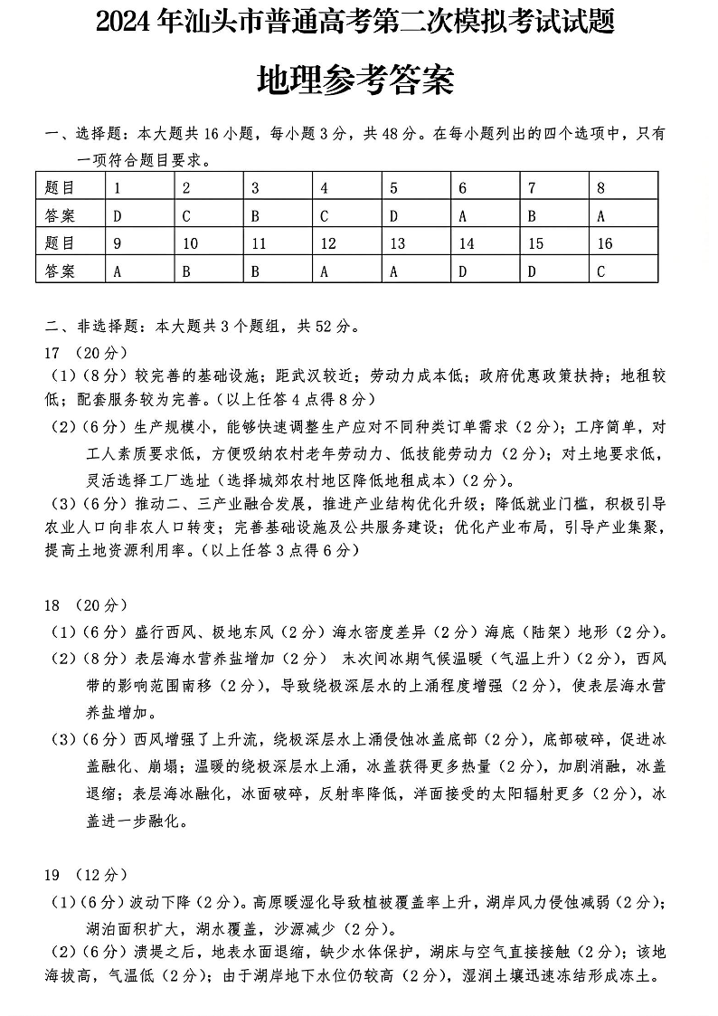 2024年汕头市普通高考第二次模拟考试+地理答案