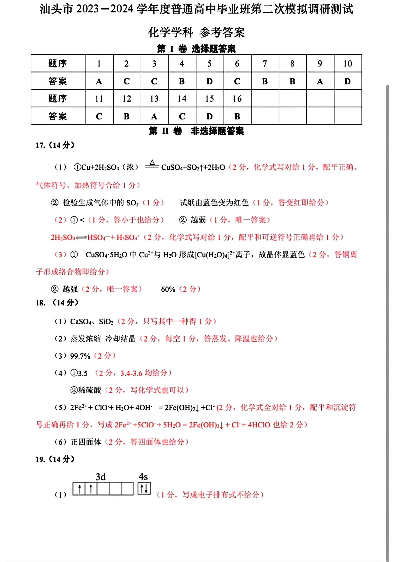 2024年汕头市普通高考第二次模拟考试+化学答案