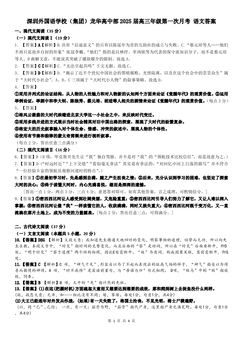 广东省深圳外国语学校(集团)龙华高中部2024-2025学年高三上学期第一次月考+语文答案