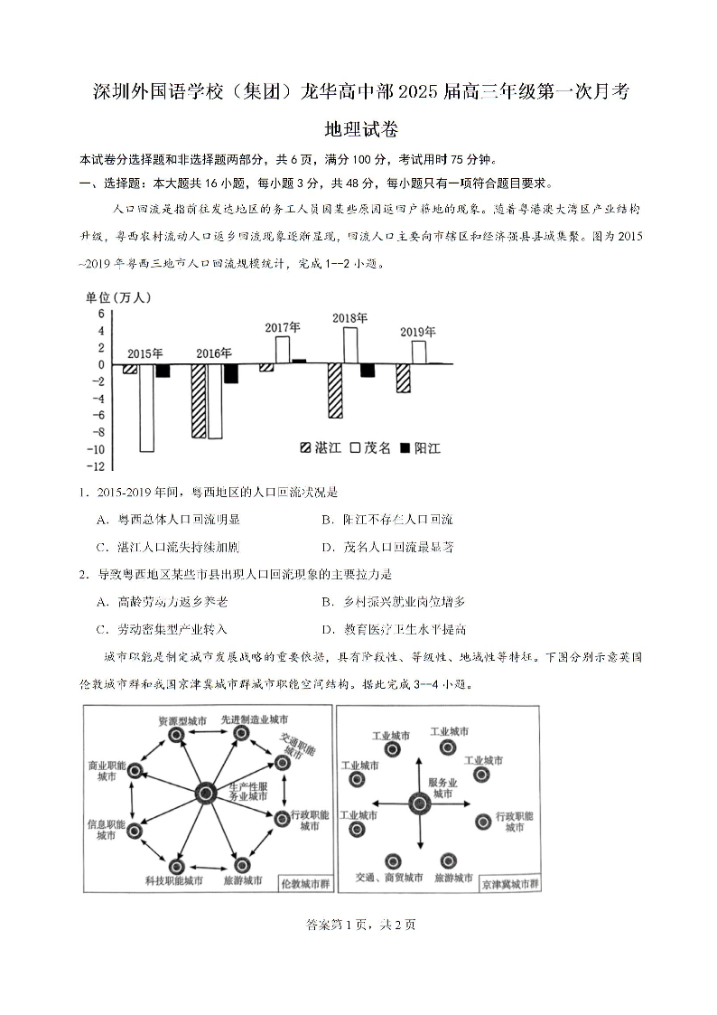 广东省深圳外国语学校(集团)龙华高中部2024-2025学年高三上学期第一次月考+地理
