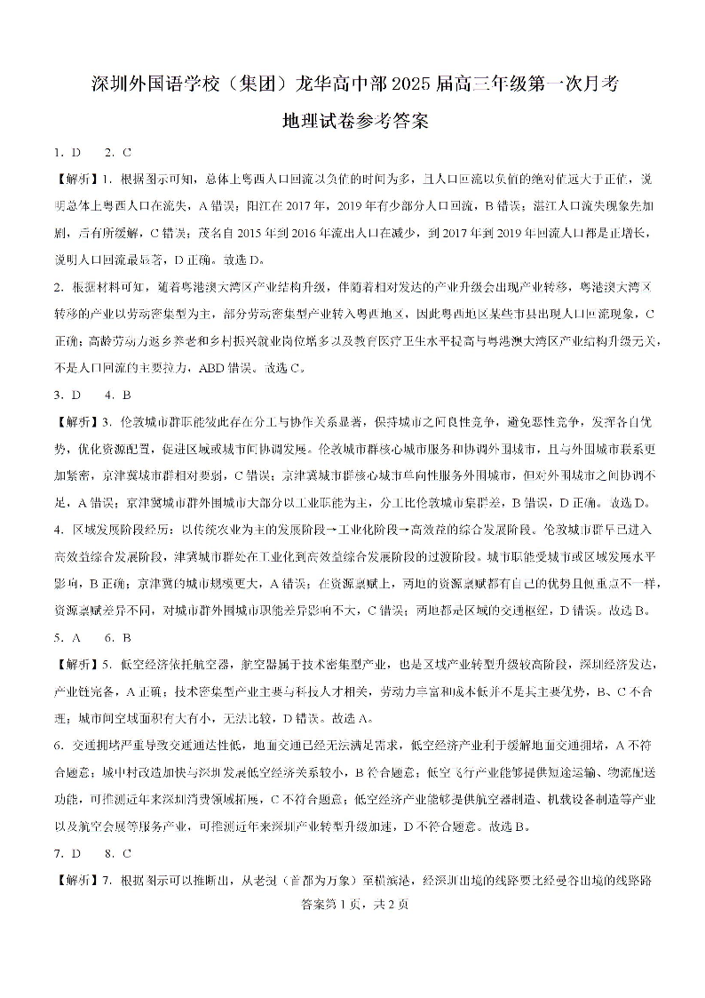 广东省深圳外国语学校(集团)龙华高中部2024-2025学年高三上学期第一次月考+地理答案