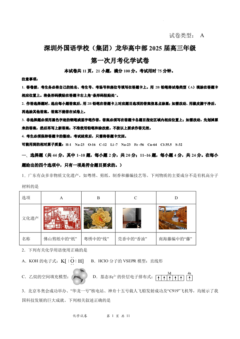 广东省深圳外国语学校(集团)龙华高中部2024-2025学年高三上学期第一次月考+化学