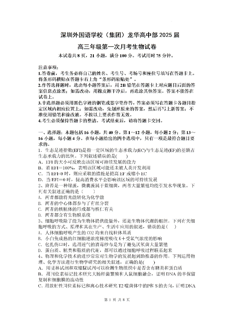 广东省深圳外国语学校(集团)龙华高中部2024-2025学年高三上学期第一次月考+生物