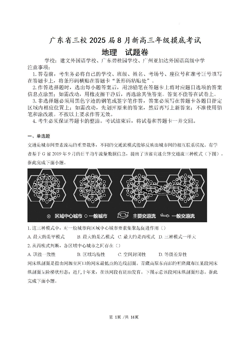 广东省三校2024-2025学年高三上学期开学考试+地理