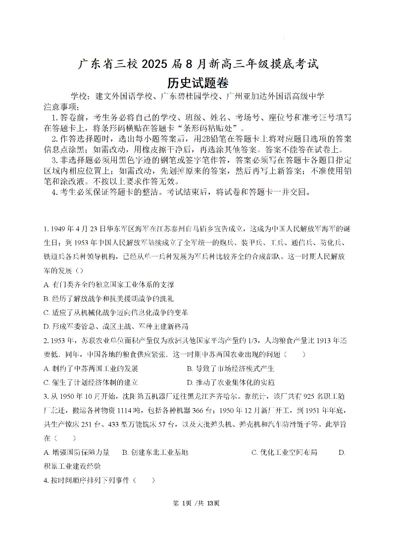 广东省三校2024-2025学年高三上学期开学考试+历史