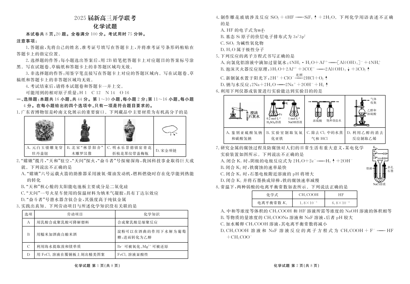 2025届广东衡水金卷新高三8月开学联考+化学