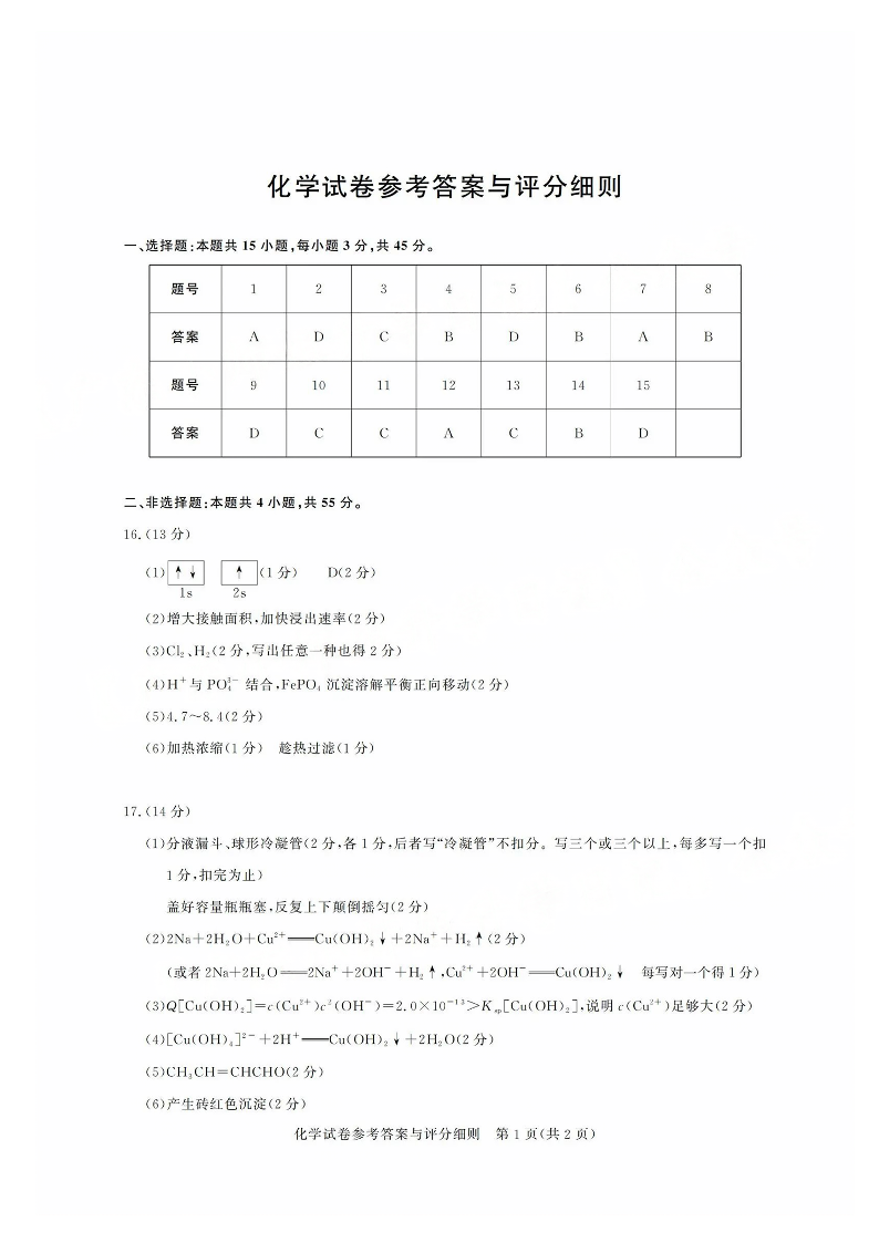 广东省2025届广州市高三年级阶段训练暨8月摸底考试(市调研考)化学答案